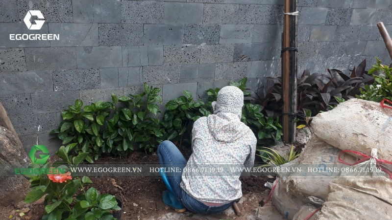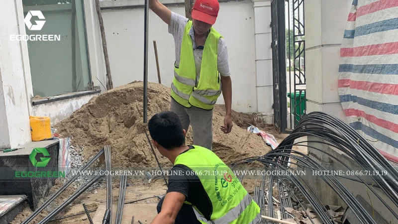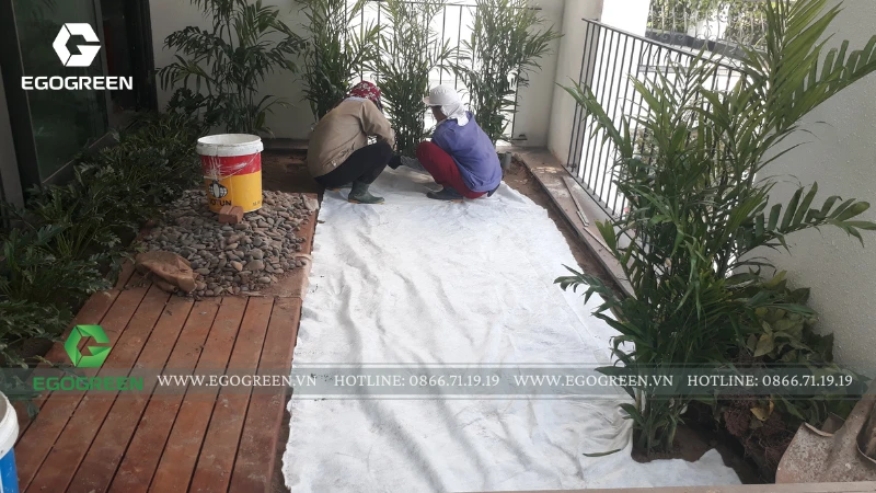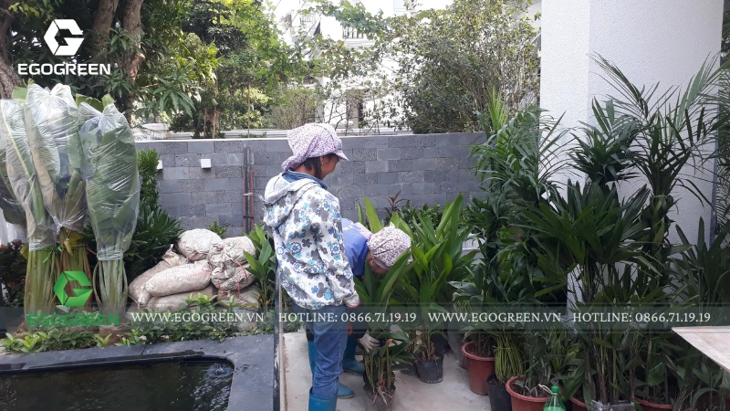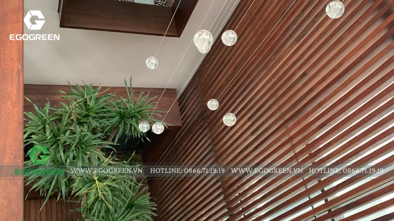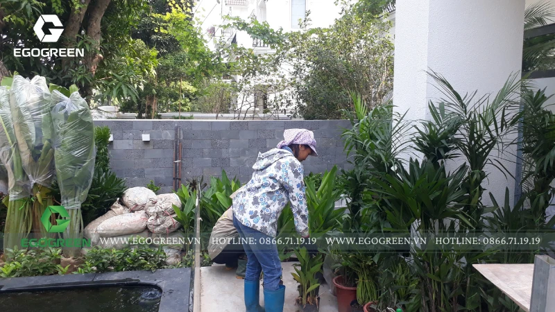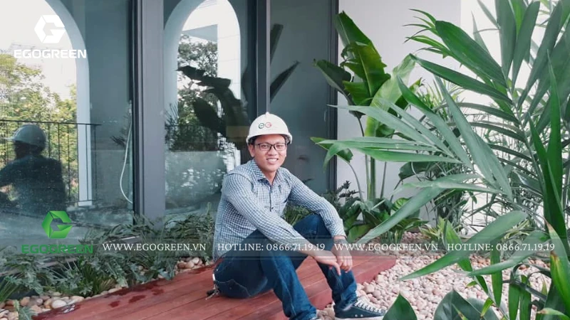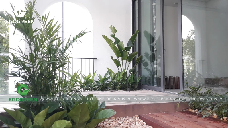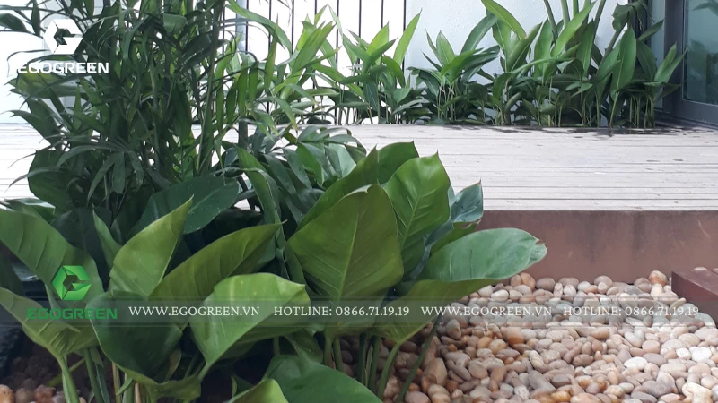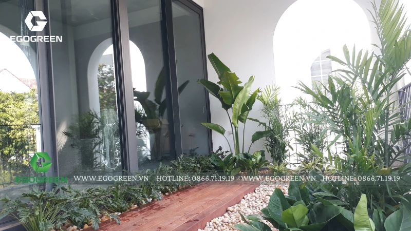 Trên mái, EGOGREEN mở rộng mảng xanh thành một vườn rooftop Tropical, rợp bóng chuối rẻ quạt, dừa cảnh và trầu bà khổng lồ. Để đưa cây, đá và sỏi tiểu cảnh lên tầng cao, đội ngũ kỹ thuật đã sử dụng máy móc chuyên dụng, đảm bảo an toàn và chính xác tuyệt đối trong từng công đoạn.