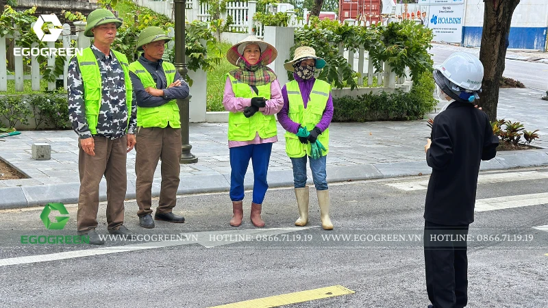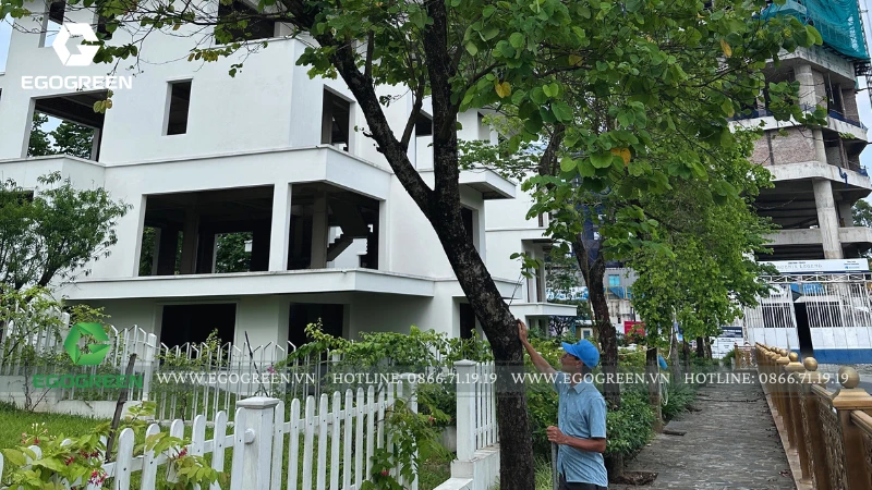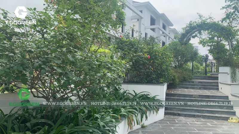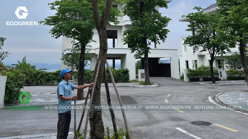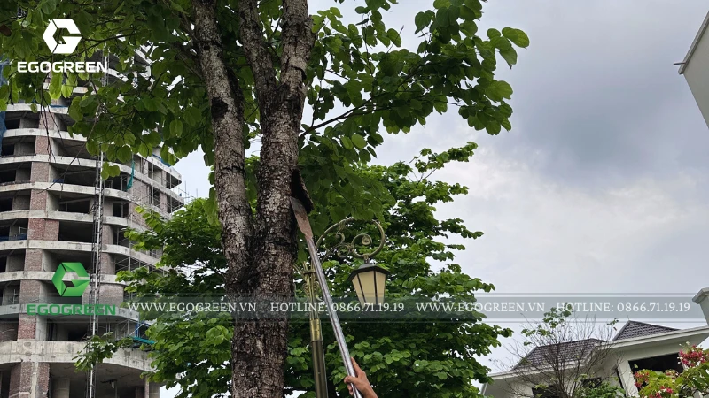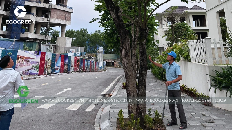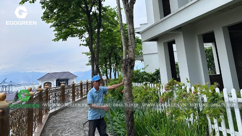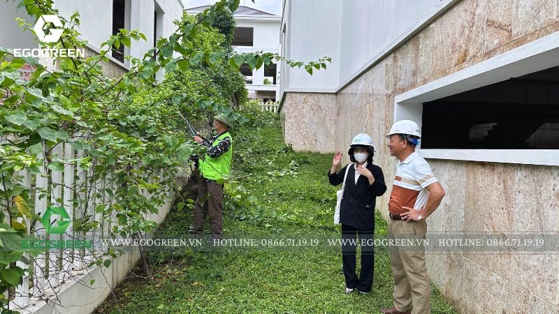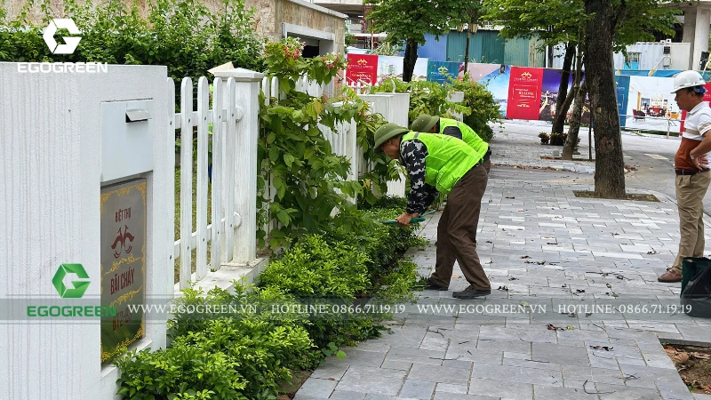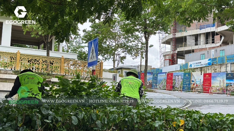 Trong giai đoạn thi công, đội ngũ EGOGREEN tiến hành cắt tỉa, tạo dáng, loại bỏ sâu bệnh, dọn tán rậm, cải tạo nền cỏ và bón dưỡng cây xanh bằng phương pháp thủ công kết hợp thiết bị chuyên dụng. Mọi thao tác được thực hiện tỉ mỉ, chính xác và an toàn, dưới sự giám sát liên tục của đội kỹ sư cảnh quan.