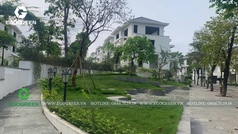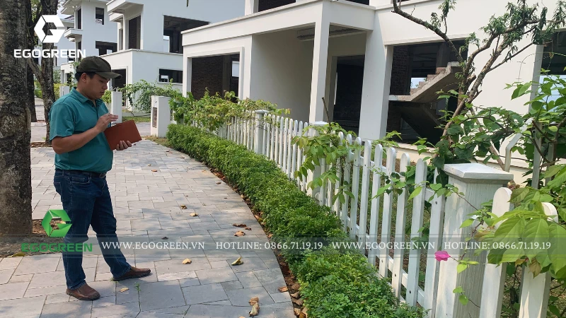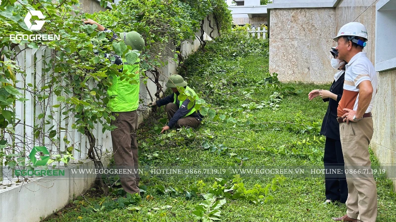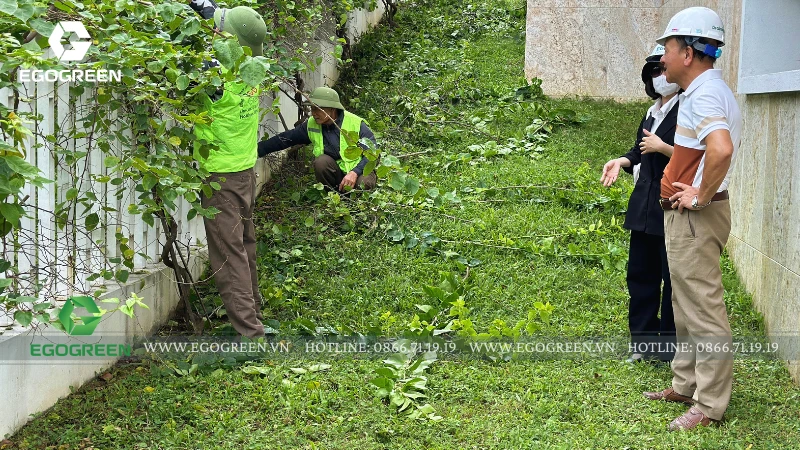 Ngay từ giai đoạn chuẩn bị, đội ngũ kỹ thuật của EGOGREEN đã khảo sát chi tiết toàn bộ hiện trạng cảnh quan, bao gồm tình trạng sinh trưởng của cây, mật độ cỏ, thảm phủ, hệ thống tưới tiêu và các khu vực cần cải tạo.