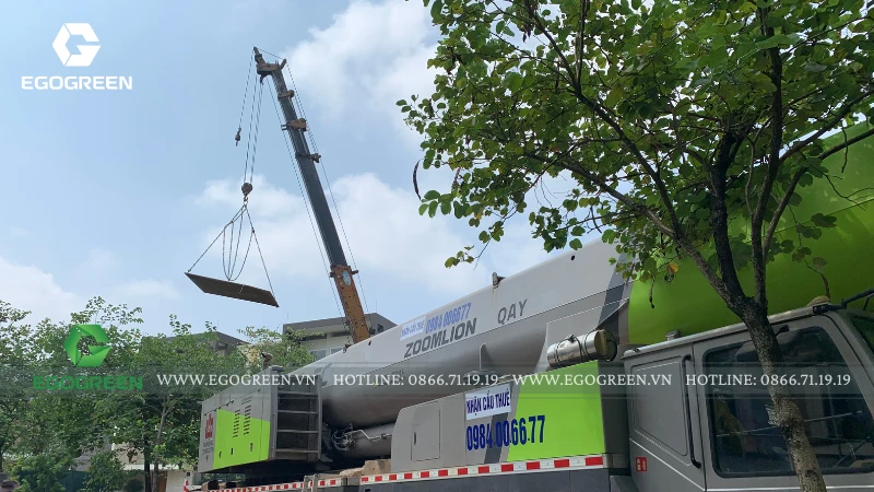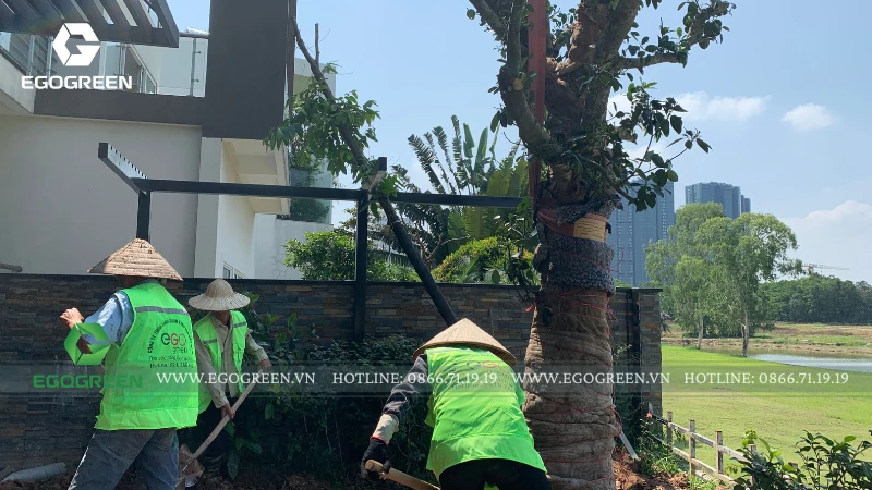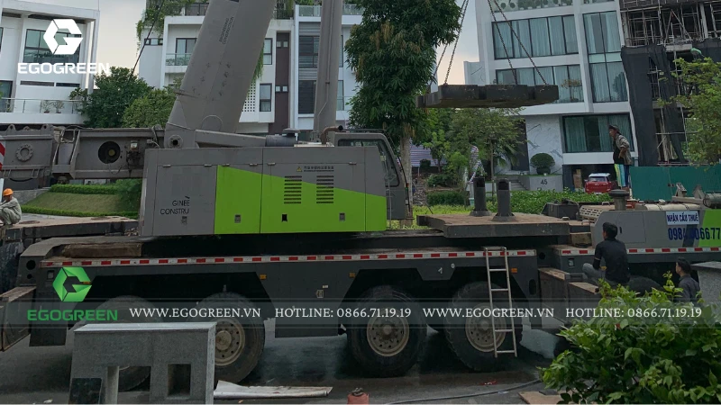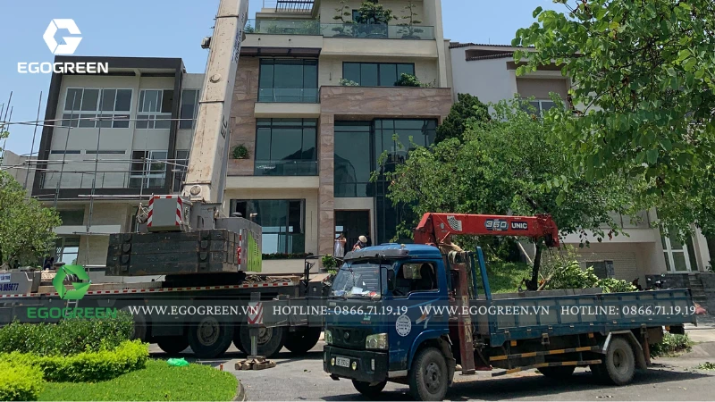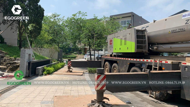 Lấy cảm hứng từ phong cách Modern Landscape, khu vườn được thiết kế với bố cục mở, tối giản nhưng ấn tượng. Điểm nhấn đặc biệt của công trình là những cây lớn, dáng cổ thụ được EGOGREEN vận chuyển bằng cần cẩu chuyên dụng, đòi hỏi kỹ thuật cao và sự tính toán chính xác trong từng bước thi công.