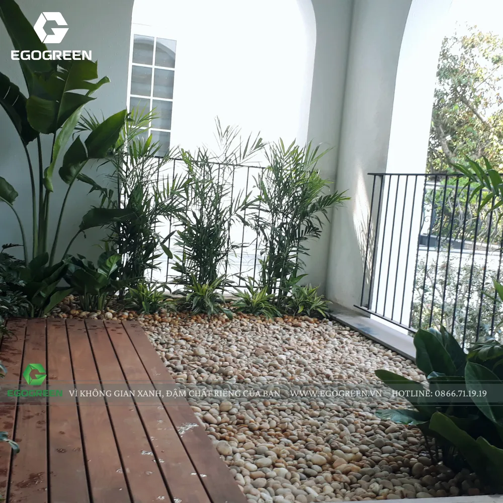 Sau đó, sắp xếp cây theo tầng cao – trung – thấp, đảm bảo thẩm mỹ và an toàn, cũng như tính phong thủy của sân vườn. Đồng thời, EGOGREEN sẽ thiết kế lối đi lát gạch chống trơn, bố trí ghế nghỉ, pergola, tiểu cảnh nước (nếu có).
