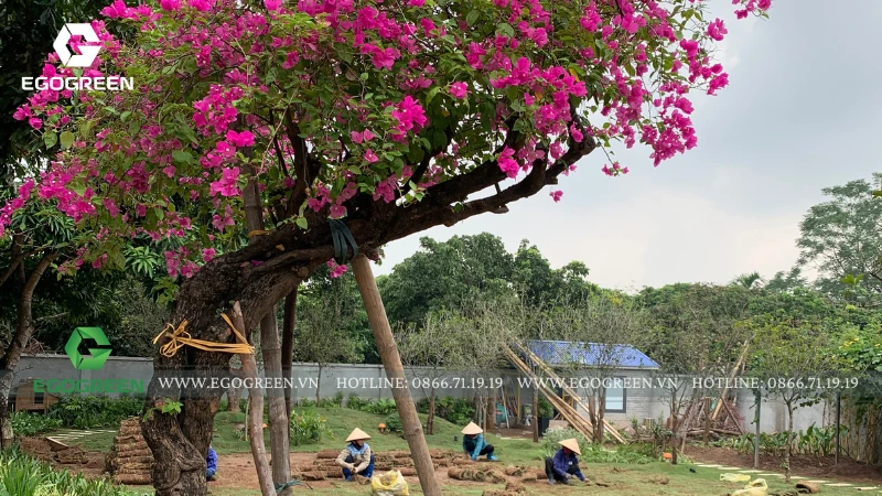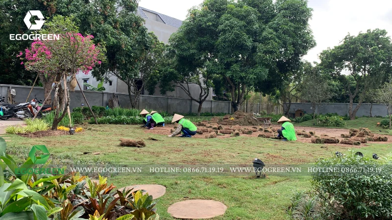 Dưới ánh nắng buổi sớm, khu vườn mở ra một khoảng cỏ xanh mướt, rộng thoáng và đầy sức sống. Những hàng cây tán lớn được bố trí cân đối quanh rìa vườn, tạo bóng mát và khung cảnh vững chãi cho toàn bộ không gian. Một số cây cổ thụ được vận chuyển và trồng bằng cần cẩu chuyên dụng, đòi hỏi kỹ thuật cao và sự tỉ mỉ trong từng thao tác, đảm bảo an toàn và độ bền cho hệ rễ.