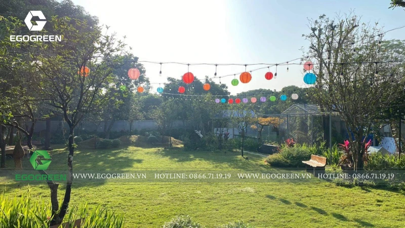 Điểm nhấn của khu vườn là những dải cây xanh mềm mại, đan xen các bụi hoa và khóm lá màu, tạo nên nhịp điệu tự nhiên giữa nền cỏ phẳng. Ánh đèn trang trí nhiều sắc treo cao trên sân khiến khung cảnh trở nên lung linh khi đêm xuống vừa hiện đại, vừa ấm áp.