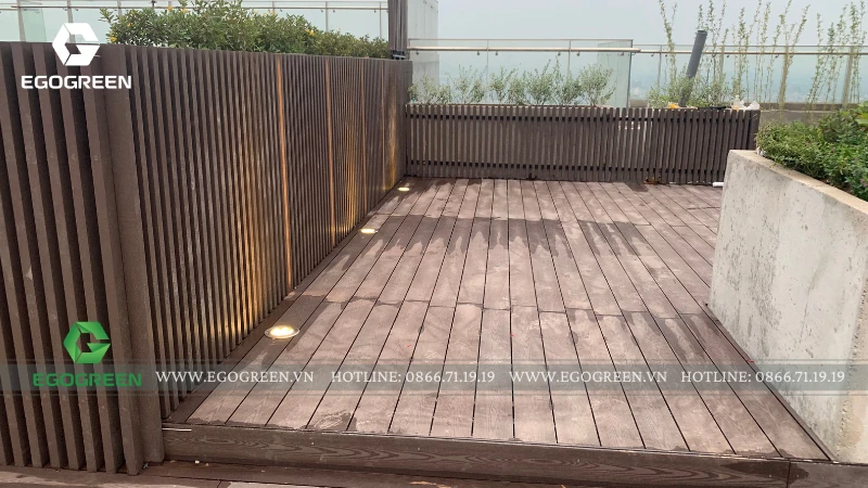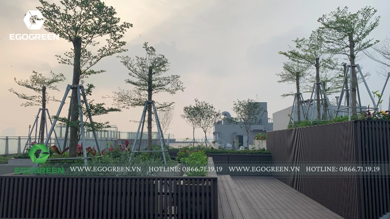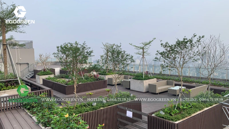Không gian được phủ xanh bởi nhiều tầng cây lá từ cây bụi, cỏ nền đến những mảng cây chịu nắng tốt, kết hợp hệ thống chống thấm và thoát nước an toàn tuyệt đối cho kết cấu mái. EGOGREEN lựa chọn vật liệu nhẹ, bền và tự nhiên như gỗ, đá, sỏi để tạo nên cảm giác gần gũi nhưng vẫn hiện đại.