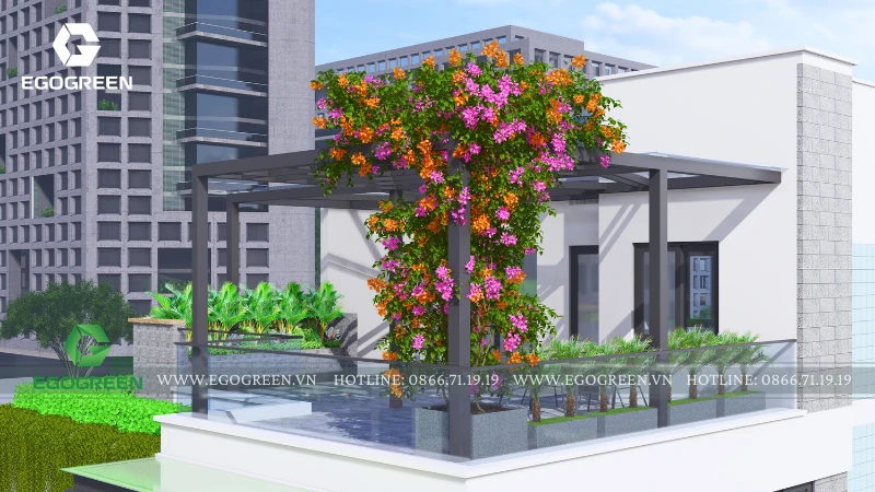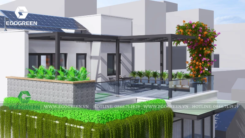 Điểm nhấn nổi bật nhất là khu sân vườn tầng thượng. Không gian này được EGOGREEN thiết kế như một khu thư giãn ngoài trời đúng nghĩa, với giàn che nhẹ, cây hoa giấy rực rỡ tạo điểm nhấn màu sắc và mảng xanh rủ xuống đầy sinh động. Khu bàn ghế ngồi được bố trí hợp lý, là nơi gia đình có thể uống trà, trò chuyện, ngắm cây và tận hưởng không khí thoáng đãng trên cao.