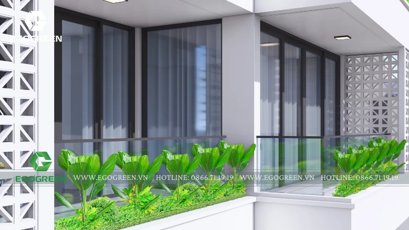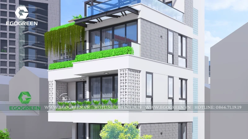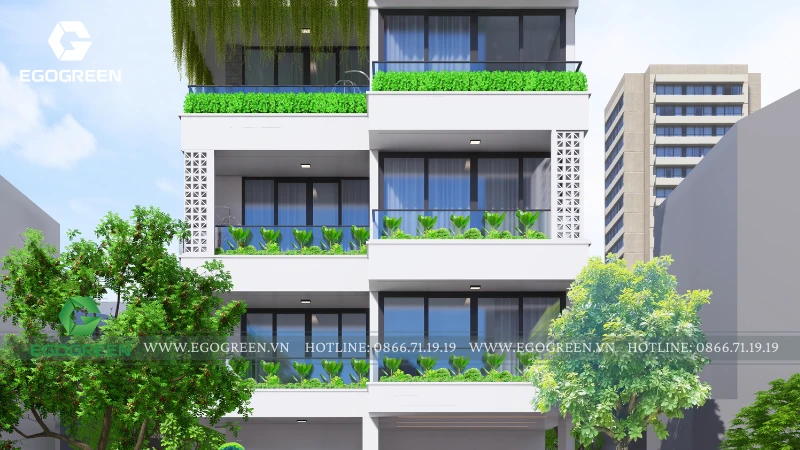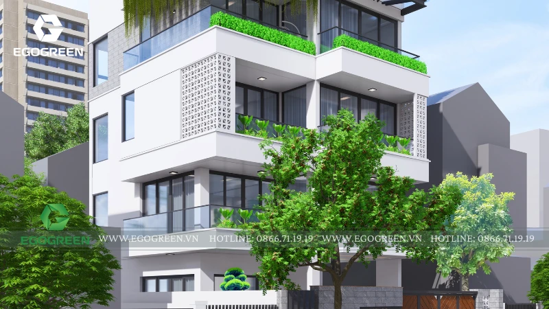 Sân vườn dưới đất đóng vai trò là lớp xanh nền, với cây bóng mát, cây bụi và thảm cây thấp được bố trí gọn gàng, vừa tạo điểm nhìn đẹp từ trong nhà, vừa giúp giảm nhiệt và bụi từ mặt đường. Các ban công từng tầng được thiết kế như những khu vườn nhỏ treo, sử dụng bồn cây âm lan can kết hợp cây xanh rủ mềm mại.