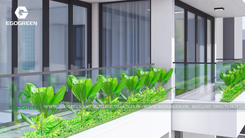 Cách bố trí này không chỉ tăng diện tích mảng xanh mà còn giúp che nắng, tạo sự riêng tư và làm mềm kiến trúc hiện đại của công trình. Chủng loại cây được lựa chọn kỹ, ưu tiên cây dễ chăm sóc, xanh quanh năm và phù hợp với điều kiện ánh sáng từng tầng.