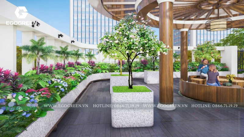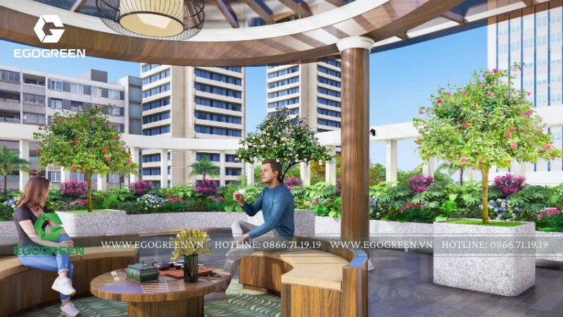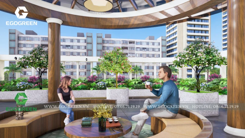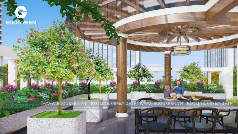 Điểm nhấn trung tâm là khu chòi nghỉ - không gian sinh hoạt chung, được thiết kế mái che rộng, kết cấu gỗ kết hợp vật liệu hiện đại. Đây là nơi gia đình có thể ngồi uống trà, trò chuyện hay tổ chức những buổi gặp gỡ thân mật. Bao quanh khu chòi là các mảng cây xanh và bồn hoa, tạo cảm giác như một khu vườn nhỏ giữa không trung, giảm bớt sự khô cứng của bê tông.