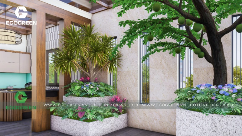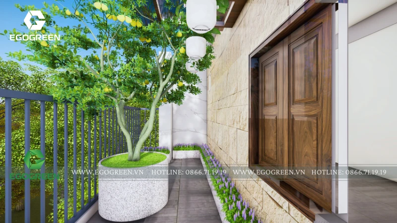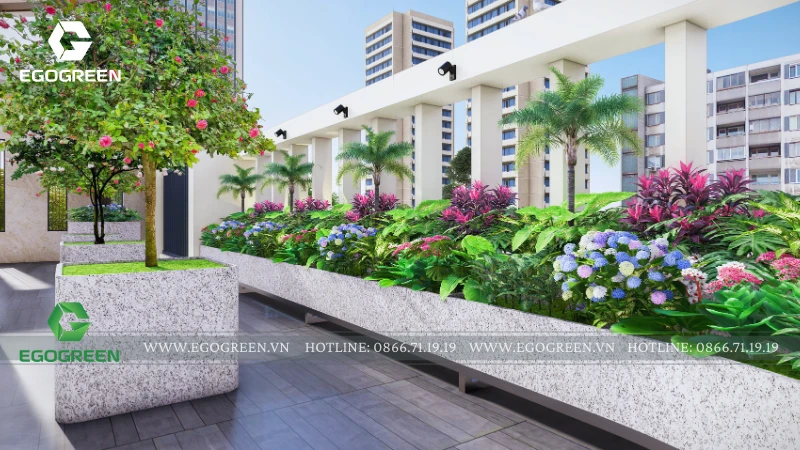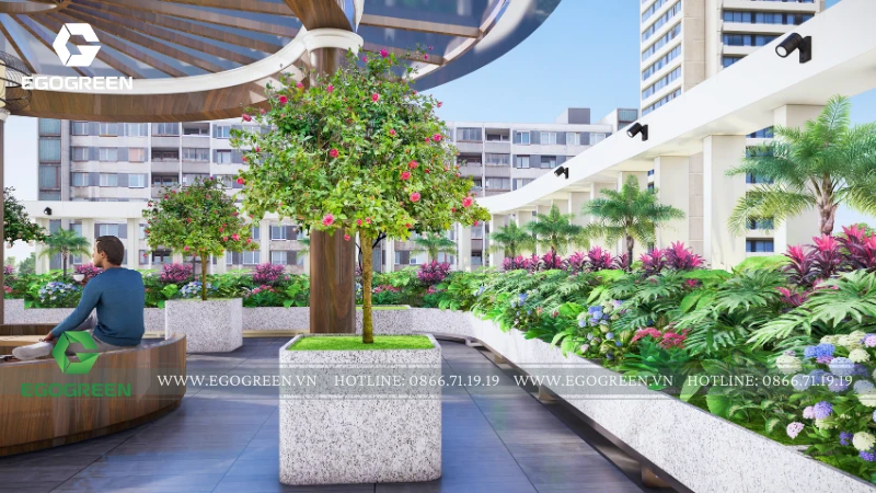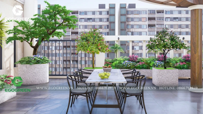 Hệ cây trồng được lựa chọn đa dạng, gồm cây bóng mát tán gọn, cây ăn quả nhỏ và các loại cây hoa, cây bụi phù hợp điều kiện nắng gió trên cao. Cây được bố trí theo viền lan can, dọc lối đi và quanh khu sinh hoạt, vừa tạo mảng xanh liên tục, vừa giúp che chắn tầm nhìn, tăng sự riêng tư. Các bồn trồng được thiết kế đồng bộ, đảm bảo thoát nước và thuận tiện cho việc chăm sóc lâu dài.