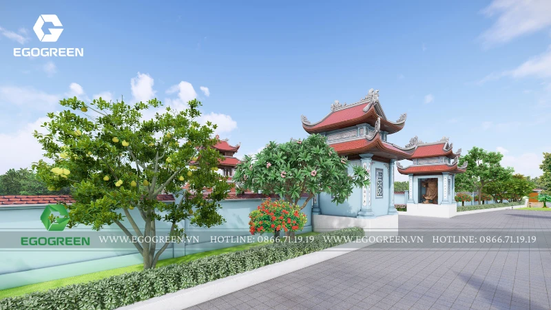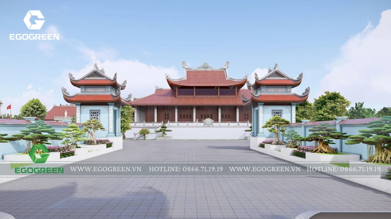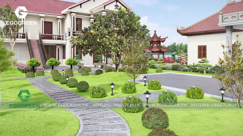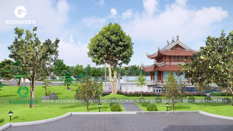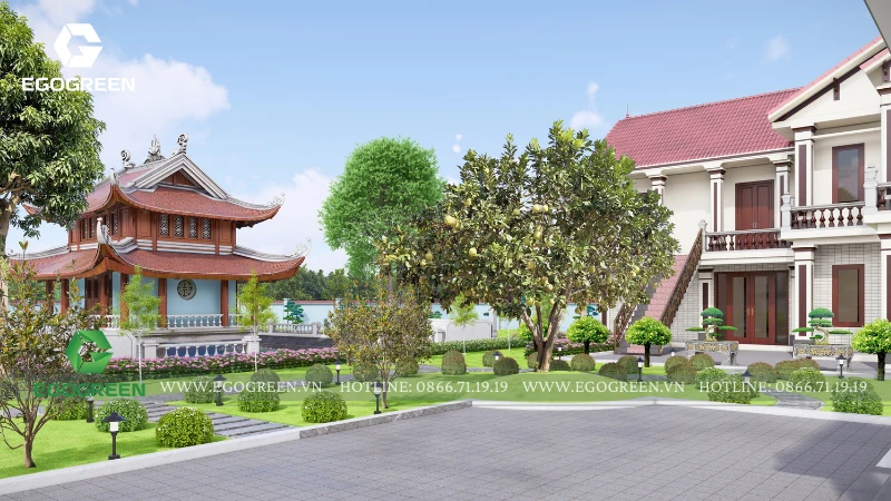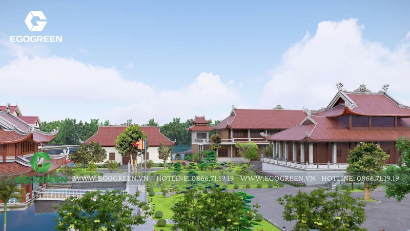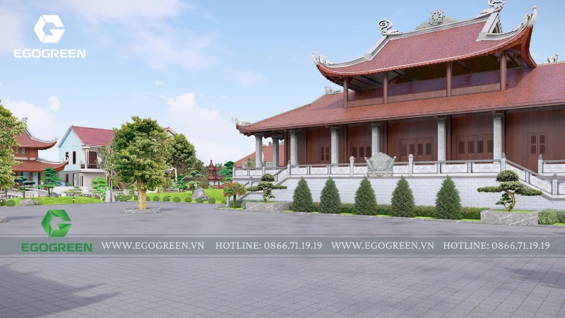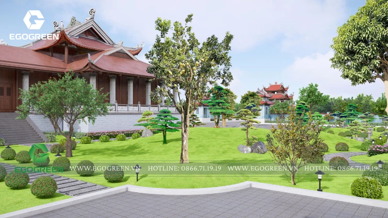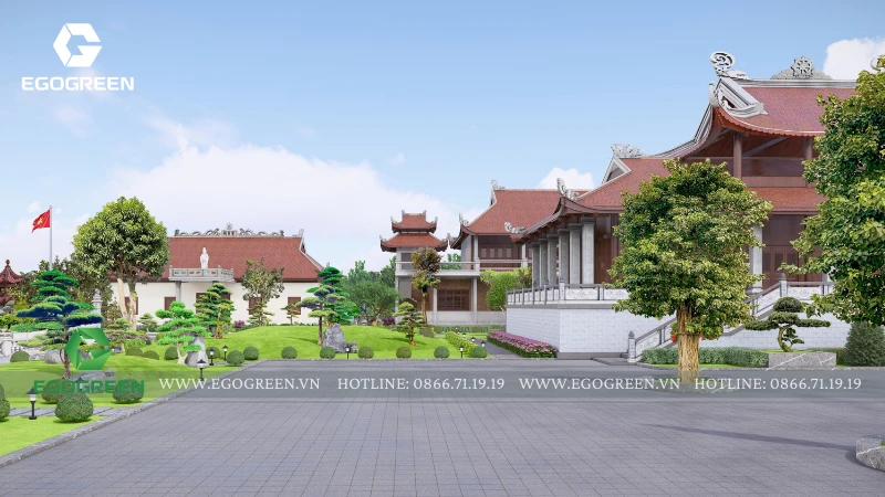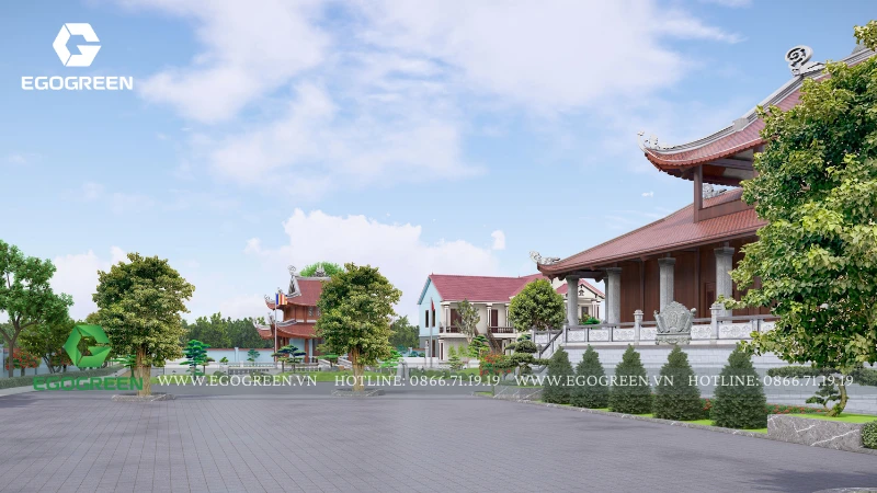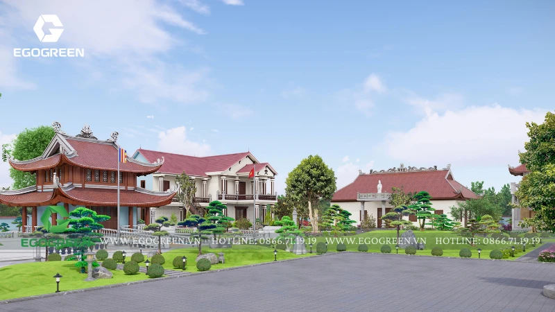 Cảnh quan được tổ chức bao quanh và nâng đỡ kiến trúc, không lấn át mà đóng vai trò dẫn dắt cảm xúc cho người hành hương. EGOGREEN lựa chọn bố cục cảnh quan mở, trải dài theo trục trung tâm, kết nối các công trình bằng hệ thống sân, đường dạo và khoảng xanh đệm. Các lối đi được thiết kế rộng rãi, uốn lượn nhẹ, phù hợp cho việc di chuyển, hành lễ và tản bộ trong khuôn viên chùa. Cao độ sân vườn được xử lý mềm mại, hạn chế bậc cấp dốc, tạo sự an toàn và thuận tiện cho mọi đối tượng.