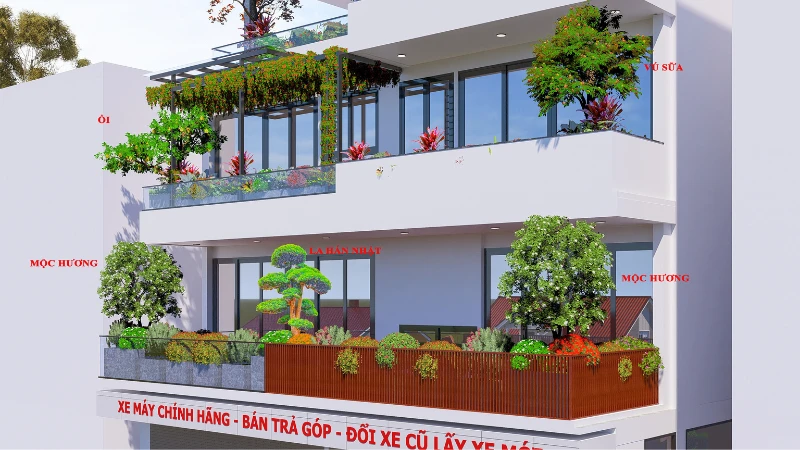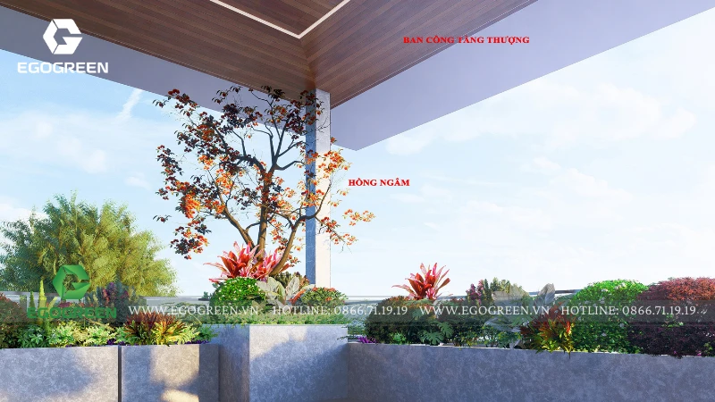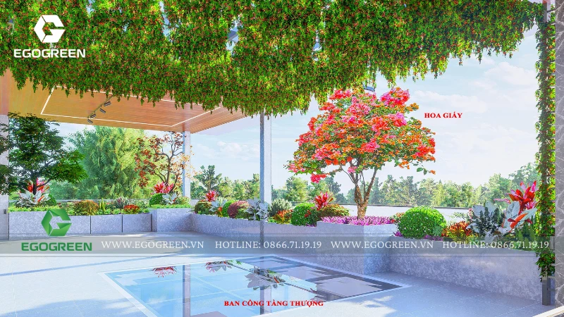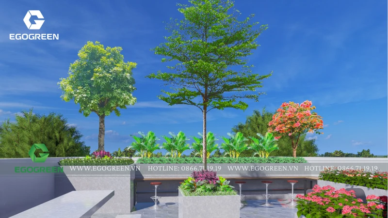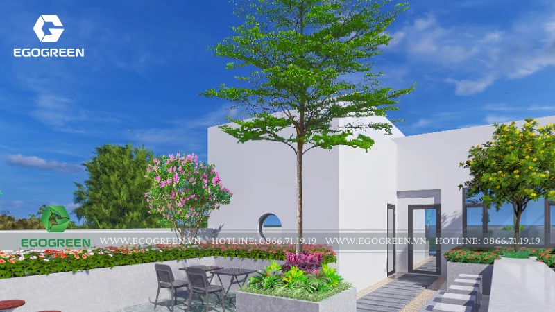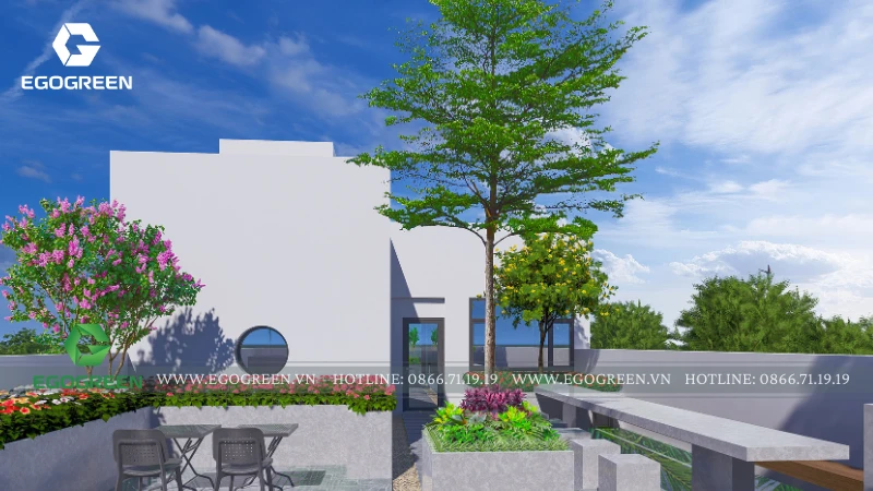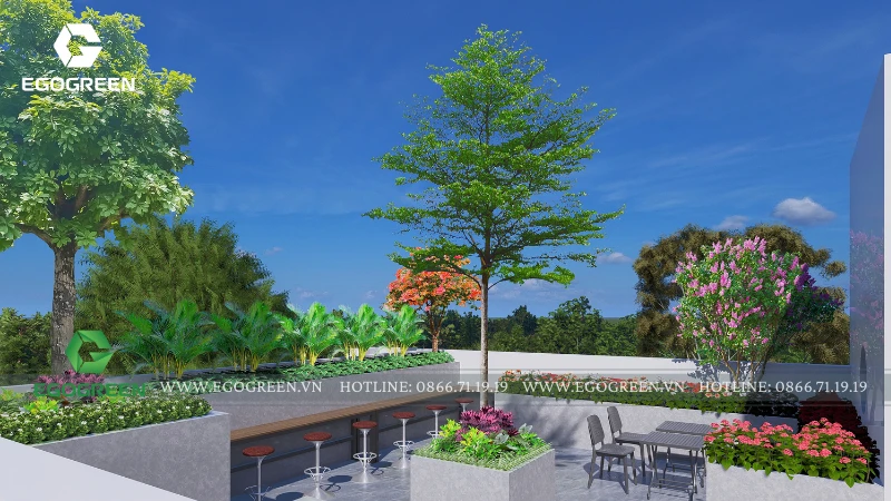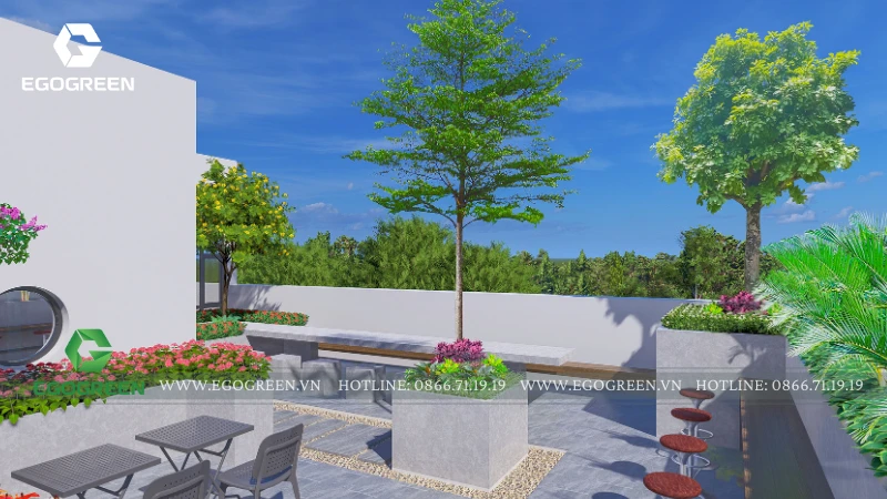 Bao quanh là hệ cây hoa đa dạng, lựa chọn theo tiêu chí dễ chăm sóc, nở hoa theo mùa, mang lại màu sắc sinh động và sức sống cho sân mái. Xen kẽ giữa các mảng cây là những tiểu cảnh nhỏ với đá, sỏi và cây trang trí, tạo chiều sâu thị giác và nét chấm phá tinh tế.